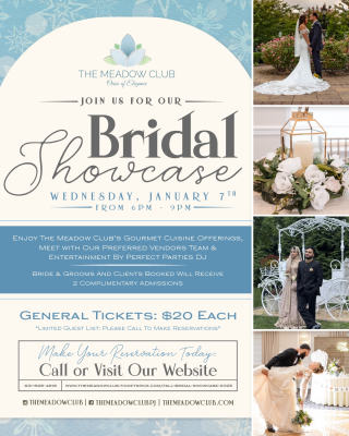 Join us for our Bridal Showcase on Wednesday, January 7th from 6 to 9 PM at The Meadow Club! Enjoy our gourmet cuisine offerings, meet with our preferred vendors, and enjoy entertainment by Perfect Parties DJ.