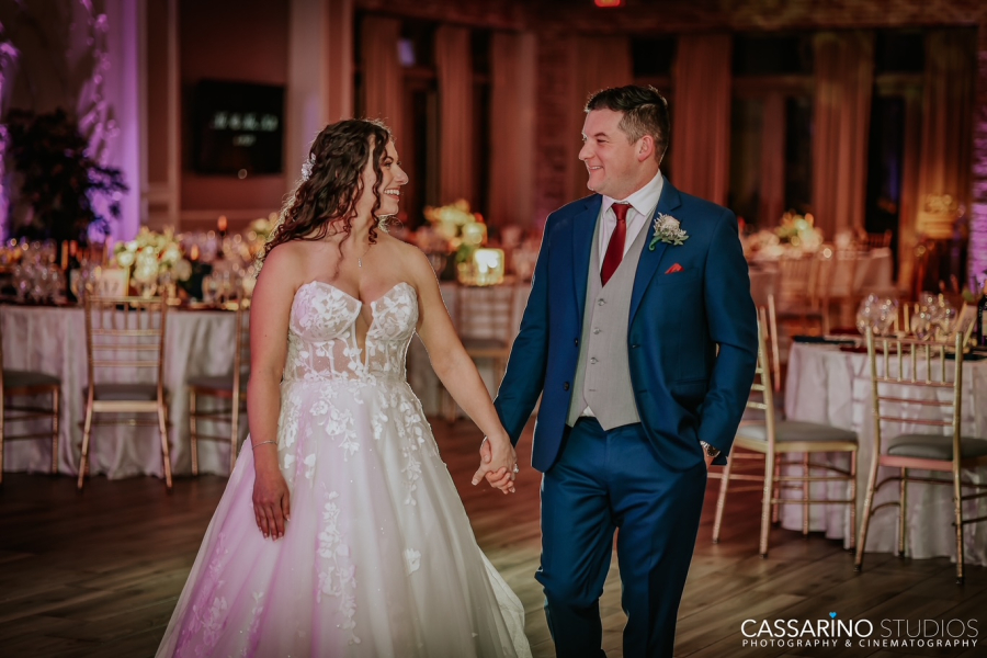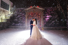 Later, as they slipped outside into the stillness of the night for photos, the snow swirled around them like a silken veil, wrapping them in its quiet magic. Snowflakes clung to Katie’s curls and sparkled on Brian’s shoulders — tiny, shimmering reminders that this moment was something extraordinary.