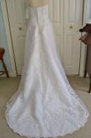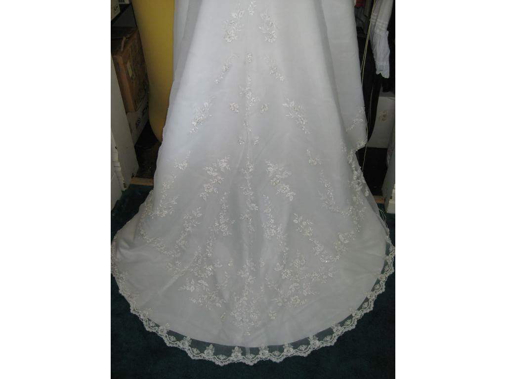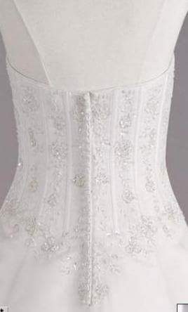 Davids Bridal V8822: White, Strapless organza corset bridal gown with beaded metallic lace on bodice, skirt, and train. Adorned with Swarovski Crystals. Chapel train. Lightweight. Size 8. Retails $700. Make me an offer.