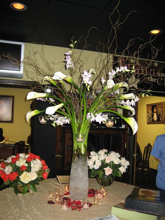 Here are a few pics of my calla lily centerpiece. It is 15 calla's with lavender dendrobrium tied to curly willow and 4 hanging votives.