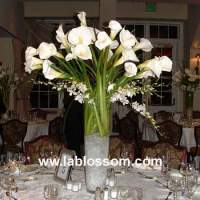 Here are a few pics of my calla lily centerpiece. It is 15 calla's with lavender dendrobrium tied to curly willow and 4 hanging votives.![]()