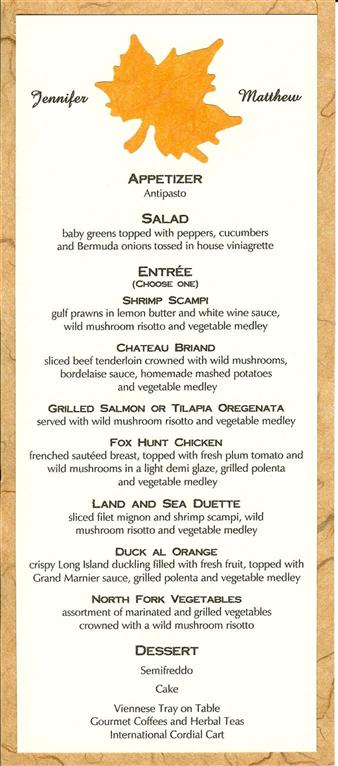 I am making mine. I have seen the Fox Hollow's, and they are just like printouts on copy paper. Nice enough, I guess, but I am going for a theme and a certain look and want as many things as possible to carry it out, you know. They don't have to cost a ton either. Below is the one I made as a sample. I am going to change it a bit however - I love the leaf cut out but I think i want a more elegant look to the menu.