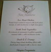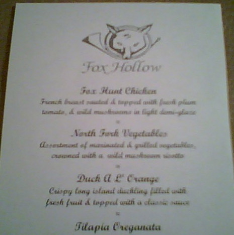 I know someone was asking about the menus provided by Fox Hollow..... I just found the one they gave me when I asked for it, so here's a pic I took of it on my camera phone.It's on cream-colored computer printer paper with black ink. The logo looks scanned in and is slightly lighter than black, more like a dark gray.