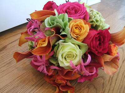 you can do white bouquets or have a mixture of fuchsia n orange flowers which will look beautiful !!