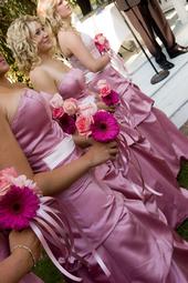 We had Alfred Angelo 6122 in Dusty Rose. It's a V-neck, tea length dress with a taffeta sash. I got them from Pearl's Place. There's a taffeta jacket available, too, but we did not get them. Faces blocked 'cuz I'm a bit paranoid.