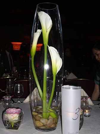 the main was the tall vase with river rocks and the callas, then there were 3 small square vases around it with a single esperanza rose in it.. i also used icheran's idea with the cylindrical lit table #s....