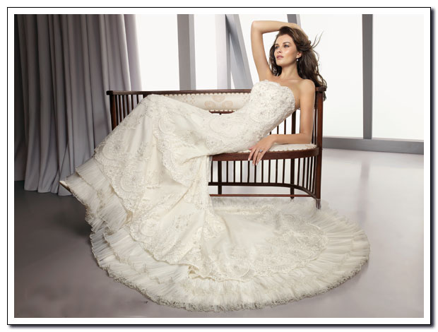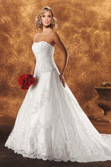 I LOVE this Paloma Blanca dress. I tried it on at Lillette's but ended up falling in love with another dress. It's really gorgeous and the whole dress is covered with beautiful lace and the dress is 100% silk. It was also actually worn by Sun in an episode of the show Lost.eta: The style number is Paloma Blanca 3958.