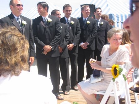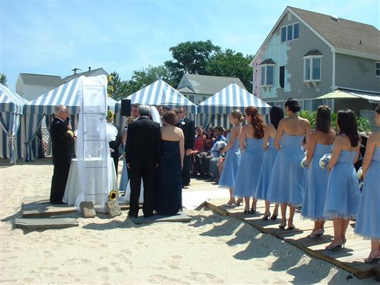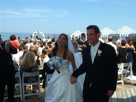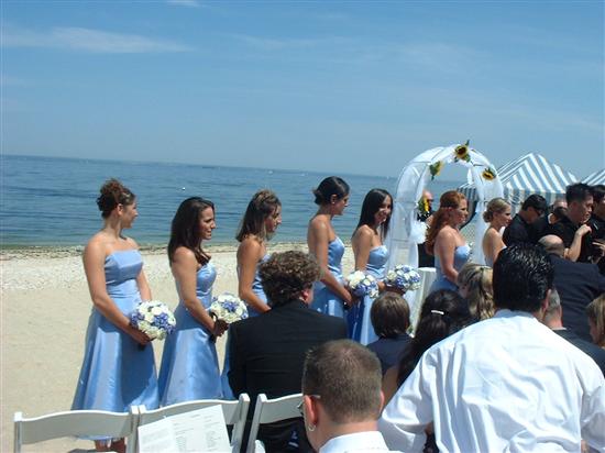 My husband wanted to elope on a beach and I wanted a wedding so the Crescent was our compromise. It was the second place we saw and when we left we never went anywhere else to look. It was perfect in every way for us. We had a morning 11:30 ceremony which I had always wanted a night wedding but in all honesty the sun and the beach and the pictures would have lost its effect if it was night. We dealt with Bill, Kathy, Denise the whole way and they were never anything less than perfect to deal with. My bridal attendant that day was Campbell and she was a lifesaver. Anything I needed she was always there. From every detail they were on top of everything. Someone must have told her that I like Iced Coffee because all of a sudden I had one waiting for me during pictures and another one waiting for me with dessert! After the ceremony they take the bride and groom into the bridal suite (which is huge and fabulous) and gave us every single item to eat from cocktail hour. They also served our main course first and gave us all the choices. The food was wonderful. We had the choices of filet mignon with shrimp, Chicken in lemon beurre Blanc Sauce and potato crusted salmon. I heard great things about each choice. Our cake was beautiful! We chose the seashell cake, white cake with cannoli filling-yummmmm. Kathy really knows how to move a party along and it was just such a wonderful experience at the Crescent. Crescent Brides you have nothing to worry about in terms of your party running smoothly. My words of advice for Crescent Brides who are taking pics on the beach is to buy white flip flops. You can’t wear your shoes on the sand so I was barefoot for the pics (you can’t see the feet) but the sand by the water is rocky and it started to hurt my feet. My husband and groomsmen wore black flip flops with their tuxes which was such a cute look that worked so well and hopefully kept them a little cooler.