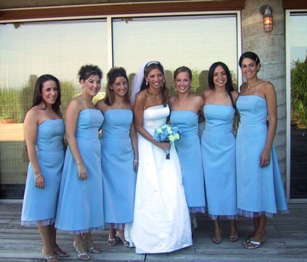 My bridesmaids got a Jim Hjelm tea length dress in baby blue and this way I saved them a lot of money from the original price. It was so easy too because I saved them the hassle of having to go to a salon to get measured and to go back and pick it up. The dresses were ready early and I picked them up from the store and delivered them to my bridesmaids. They all got their alterations done at their leisure at their own place and they looked perfect.