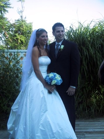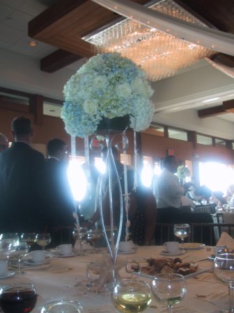 What can I say about John which has not been said before. He was absolutely my husband and I’s favorite vendor throughout the whole planning process. He is so relaxed and has great ideas and is honest. I came in with a vision of sunflowers and we changed it to a blue and white vision with sunflowers at the ceremony and cocktail hour. My bouquet was perfect. It was blue and white hydrangea, blue delphinium, white roses and stephanotis. The girls had more white than blue and I had more blue than white. There was supposed to be bunches of blue flowers with sunflowers on the arch but John was smart enough to know that my arch was crappy and by putting more flowers on it was going to make it fall over! My centerpieces were awesome!!! High alternating heights bases with blue and white hydrangea and white roses. John attached matching ribbon on the bases and glued sea shells on them. Then he placed huge starfish at the bases and sprinkled other sea shells around it. It was a perfect beach themed idea. I loved everything about my flowers.