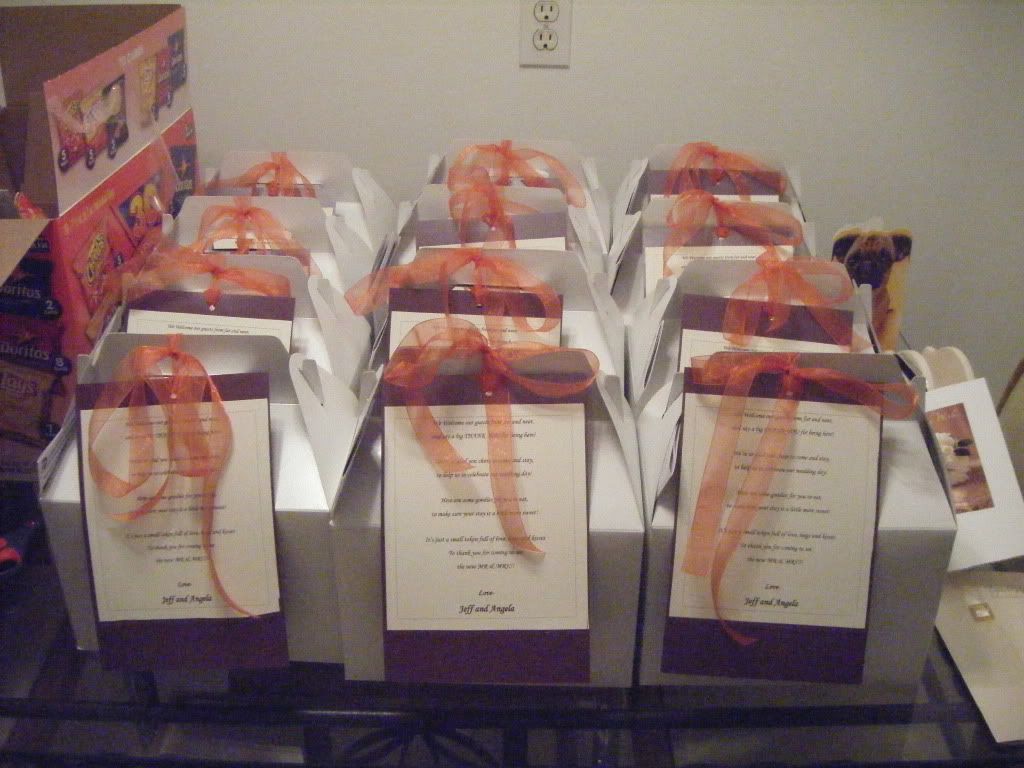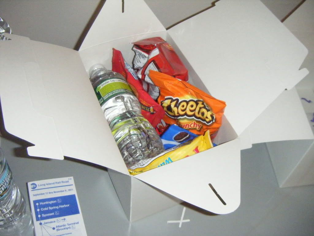 I got the boxes from a LIW bride that had extras, and then hit up Costco! We put something sweet, salty, and a bottle of water. I added the poem to the front that I stole from another LIW Bride (the best ideas are someone elses it seems).
