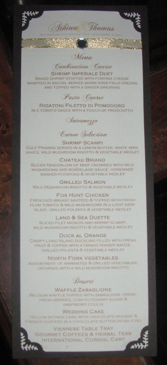 Personalized Menus= A+ : I wasn't crazy about the menus provided by the Fox Hollow and I wanted to keep things uniform so we made personalized menus. We bought the ivory linen cardstock from Staples. The gold ribbon, corner puncher and rhinestones from Michael's and brown matting paper from thepapermillstore.com. I designed them on MS Publisher, DH printed and cut them, then I did all additions (ribbon, rhinestones, matting).