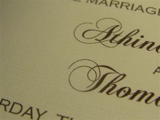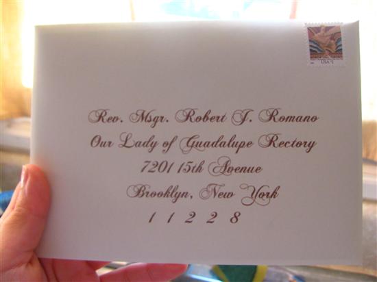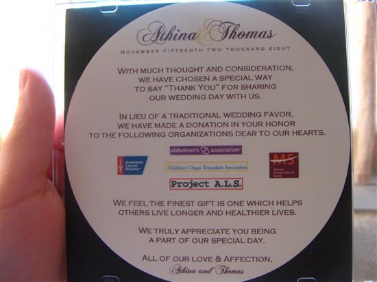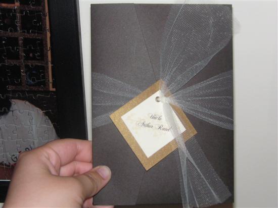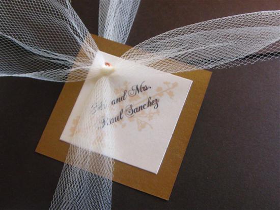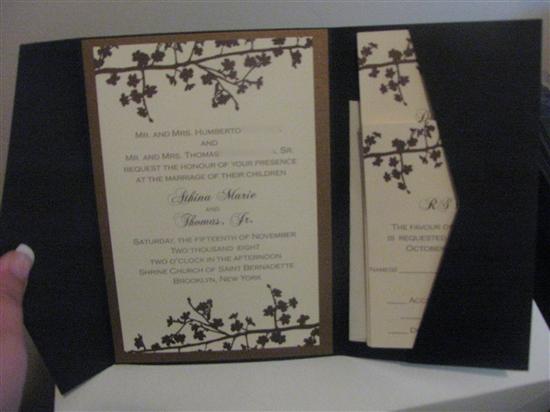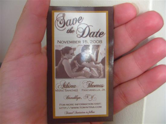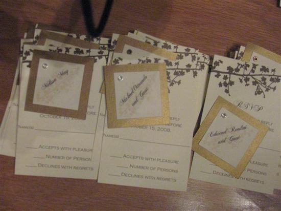 Invitations= C & A++ : We ordered all the materials from cardsandpockets.com. I used Adobe Photoshop to design the invitation. It was so much fun. My mom really wanted thermography, which obviously I couldn't do myself, so we sent them out to a friend of her's who was supposed to print all the pieces in brown thermography which to make the invitations 'pop.' However, (this is where the C comes into play) when we get the invites they were not printed in thermography. He refunded us for the difference though and I still love them. The company is precisionprintandphoto.com and very easy to work with. The A++ is for our DOC, Christine, who printed our RSVP envelopes, mailing envelopes and adhered the matting & invite to the pocketfolds because I got backed up with my mom being sick. She was so helpful and did a fabulous job! Since my mom wanted to be a put of the process, FH and I bought all the invites up to Binghamton and she helped us stuff the pocketfolds, tied the ribbons on with the 'tags' that acted like an inner envelope and stuffed the envelopes. It was a family affair, even grandma helped.