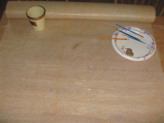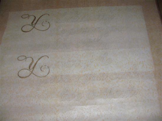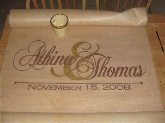Aisle Runner= A : I bought a buttercup aisle runner from invitationsbydawn.com. I enlarged and printed our monogram and a quote from MS Publisher, taped it together and outlined it wbith a pencil. Then I colored it in with brown and gold fabric paint from Michael's. It took a LONGGG time b/c I'm a perfectionist but it was so worth it.