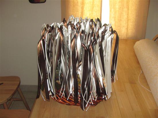 Ribbon Wands= B+ : Our church doesn't allow petals, rice, bubbles, butterflies, etc. So again I turned to LIW and found a picture of ribbon wands. I loved the idea!! We ordered the personalized ribbon and wands from myweddingfavors.com. They came within a week and the quality was very good. The down side of them was they were very plain. We wanted to add a little something to them so we used thinner ribbon in the opposite colors too that we bought at Michael's.