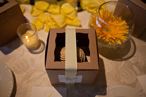 We also ordered our cupcakes for favors from Black Forest, to save time DH picked them up and we boxed them at my parents house the day before the wedding. I bought the cupcake boxes online, printed the Thank You stickers and cut the ribbons myself, and one quick assembly line later, 130 cupcakes were boxed and ready to go.