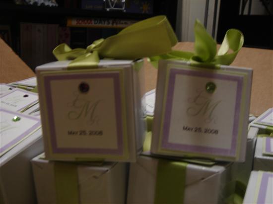These were a royal pain in my butt. Assembling these alone took me 3 days. I had to pack them with the kisses, tie the ribbons then attach the favor tags. I got so sick of it but I liked how they came out.