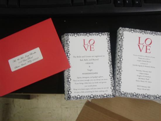 Because my bridal party was scattered all over the East Coast and because I'm a take charge planner, I planned my bridal shower. The search for the location was haaard but I finally went with our local Knights of Colombus. My mother paid for the room and the catered food which we got from a local Dominican restaurant. My MOH bought the favors and helped out a lot the day of. My grandmother who was dying of Pancreatic cancer at the time, insisted on buying the cake. Everything else was from me. As for the theme, I wanted it simple, no pink or frills because we decided on a jack/jill shower. We went with red, black and white. I took Jenlen's idea of the Philadelphia LOVE statue and used it in all the shower stationary. Everything was DIY and came out real cute. We didn't have such a huge turnout but we still had fun regardless. We played a few games that both sexes enjoyed. We had bingo, door prizes, toilet paper dress, guess the Bride/Groom and the Newlywed Game.
