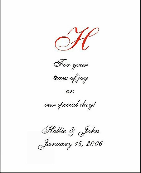 I bought my favor tags and cry packs from Angie of Favors for You. She has a store on Ebay. She did a fabulous job with both items I purchased from her. Some of the cry packs got stuck together and ripped a little. She replaced all of them quickly and without any problems. Definitely check her out! I don't have any pics of the finished cry packs... I'll have to take one!