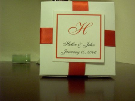 I purchased the favor boxes (3x3) and ribbon (single sided red satin) from Papermart. Shipping was quick and they had the best prices for both items. I would purchase from them again in a second! See above pic for products!