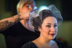 Kim is an awesome person and a talented hair stylist. She really did a beautiful job on our hair and gave us the retro look we were going for. She traveled from Bellmore to Elmont on the day of without a travel fee and arrived early so she could discuss what the girls were envisioning for their hairstyles. Kim owns a new salon called Bedford & Mane (and it’s beautiful), so I went there for my hair trial (I also had a makeup trial with her) and again on the day of our legal marriage ceremony (3 days before our reception) so Kim could dye my hair and put extensions in for me. My hair is super thin and frizzy/curly, so it’s not easy to work with. But, Kim worked some hair magic on me and made it look like my hair was thick and full. Like me, Kim is a self-professed “crazy dog lady” and was so much fun to talk to during the trial and on the day of. Since we were a pretty low-maintenance bunch of girls, we gave her wide latitude and asked her to just use her judgment and creativity…and her interpretation of what we wanted was perfect.