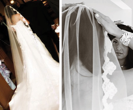 Love the veil! I had the veil custom made and I love how it came out. I found that doing a custom veil there was not too easy… I wasn't given too many ideas, so I had to keep asking to see certain elements. Several months later, I went there to pick it up but the veil it was not laying on my head flat, it was bucking on both sides near the clip in the middle. I had to ask them to fix it etc.. They did and it looked great. but that took another week. I love the feather clip. I changed into that for the reception. The clip was not very sturdy though and I had a tough time getting it to stay in. Used alot of pins but it worked out.