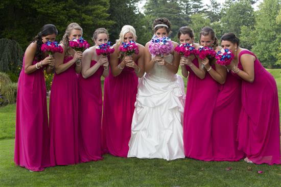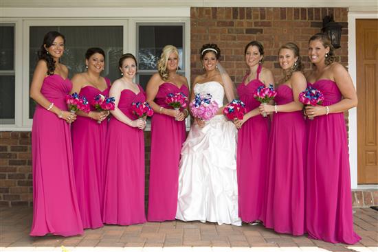 I let each of my girls pick her own style in the same color and fabric of Bill Levkoff’s designs. I loved the color (Watermelon) and fabric (chiffon). It was perfect for my summer wedding…some of the fabric caught easily which led to runs so every girl had to be careful with avoiding pulls but overall, the dresses were beautiful in photographs and comfortable for the girls to wear.