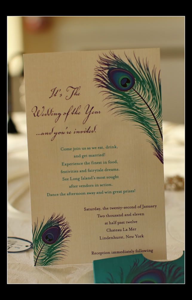 Can I say WOW!!!! When Kim told me that the theme for TWOTY was peacock feathers I was super excited! And then I received the invitation for TWOTY I was floored!!! To me the invitation sets the tone of the wedding and when I opened this invitation all I could think about was what a fun time we were going to have at TWOTY! MagnetStreet did an AMAZING job with the invitations!! I loved the vellum overlay, bellyband and the way they incorporated the purple and teal! Just beautiful and the quality of the paper was great too!