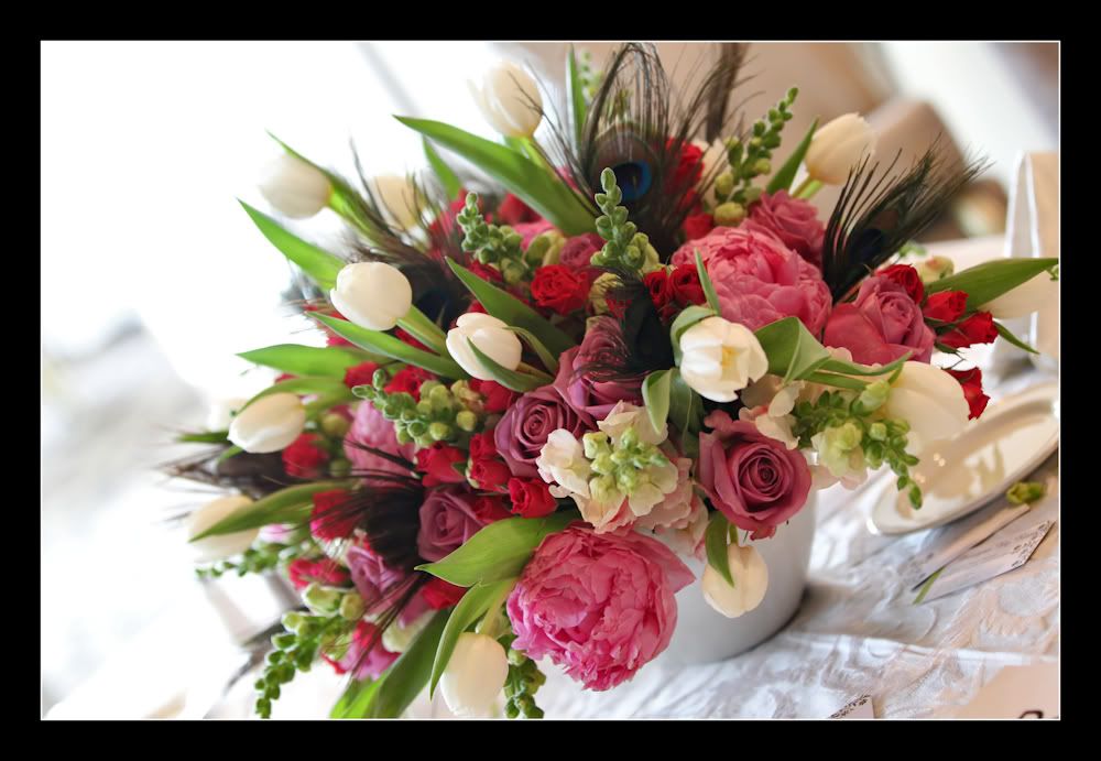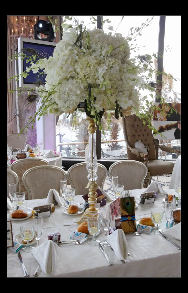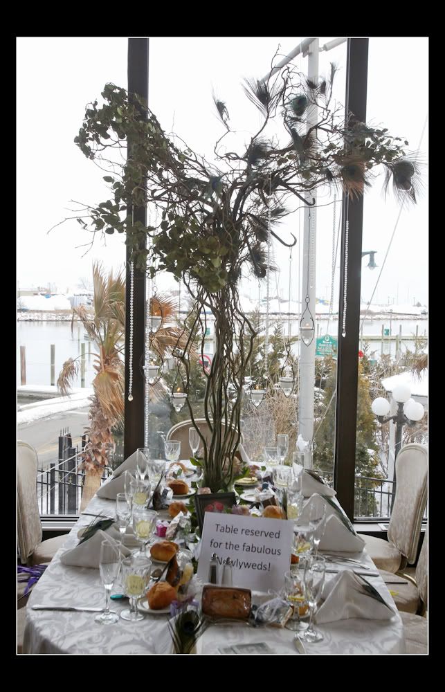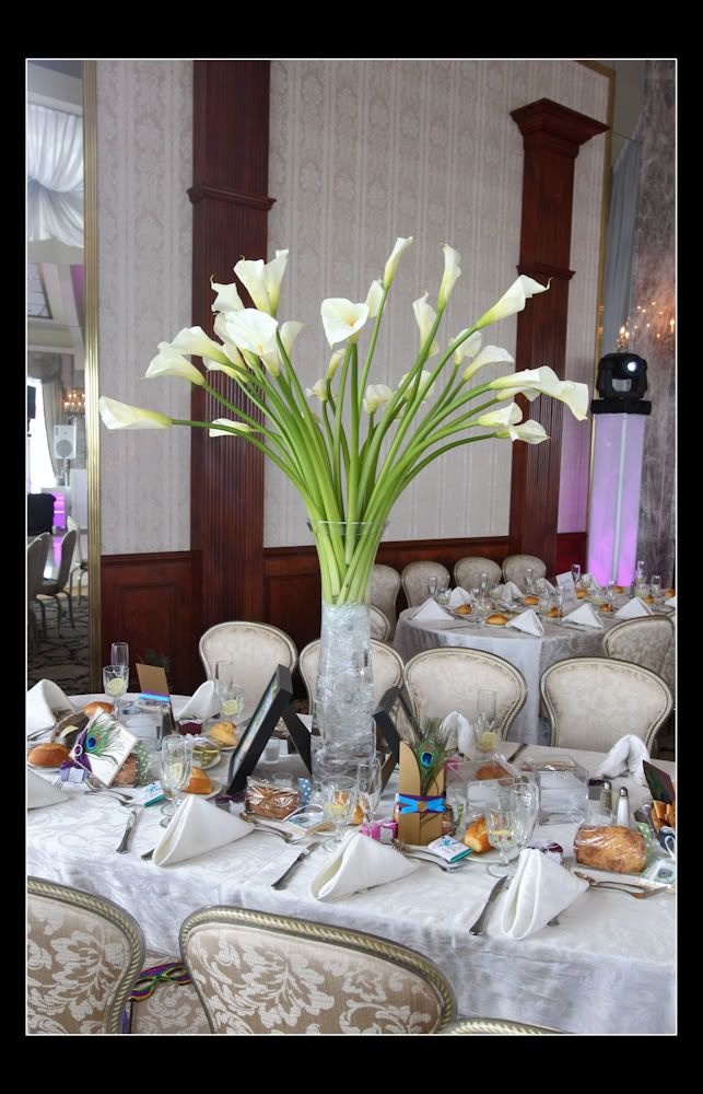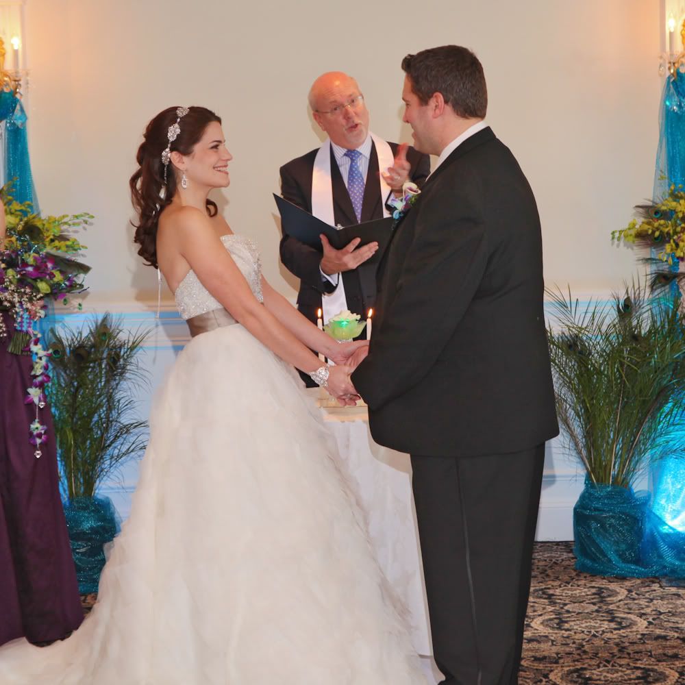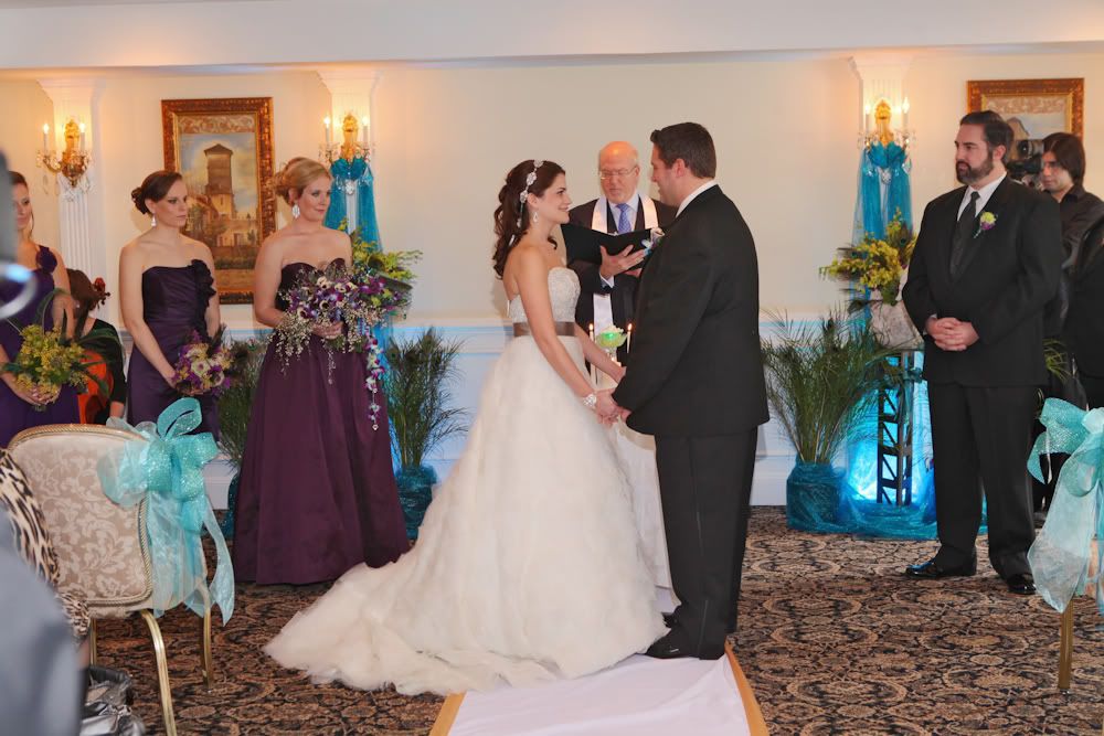 The ceremony room décor was great. The peacock arrangements were really pretty and went so well with the theme of the wedding. The room was draped teal and matching aisle bows on the chairs.