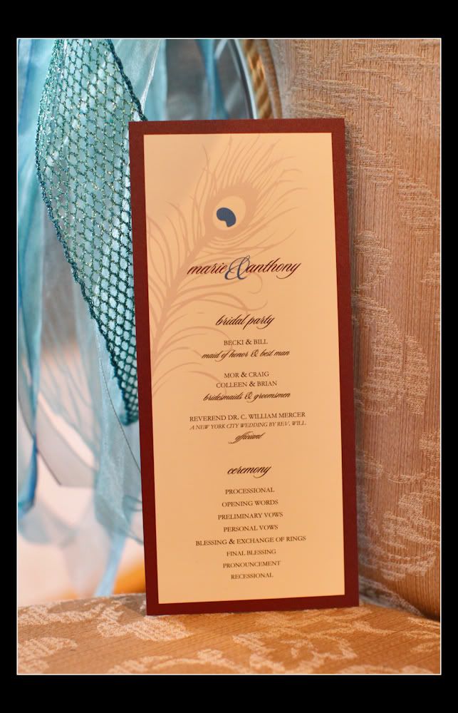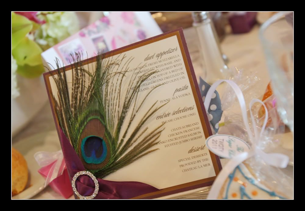 The menus were AMAZING – I saw 2 different designs both were accented with peacock feathers, one style had beautiful layered ribbon with a wax seal and the other design had a rhinestone buckle. Both designs were breathtaking! The programs were just as beautiful!!!