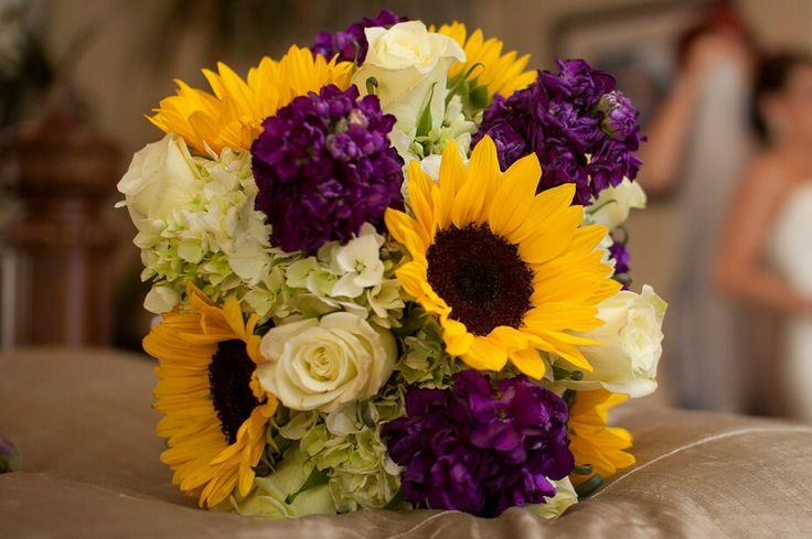 #1 - Lt green hydrangea, sunflowers, dark purple stock, swap purple roses for the ivory ones pictured