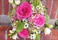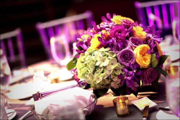 # 2 - Lt green hydrangea, purple & yellow roses, purple mokara orchids