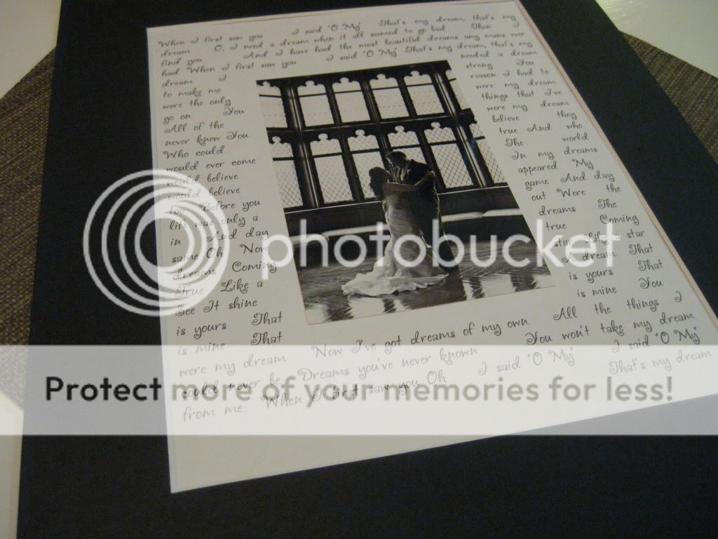 As a gift on the morning of the wedding, he gave me a 3-photo frame (5x7's) and in the middle, there is a photo of us, and it was engraved with a saying that means a lot to us. he said the two frames flanking the middle one are intended for our vows, so as a surprise i'm having the vows professionally done so it looks really nice in the frame.