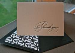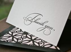 I found these thank yous on Etsy and they are letterpress. The color of the cards and envelopes will be different than in the below pictures. The seller is going to use light cream colored paper with a matching light cream colored envelope. I love them and they match our invites perfectly (we used the same font and paper color)!!