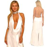 Lovely as a casual beach wedding dress or special occasion dress. Full length ivory chiffon gown, gathered and delicately flounced side with small fabric covered buttons. Open back with spaghetti strap ties for custom fit. Wonderfully comfortable! Comes with matching shawl/wrap. Fully lined. 100% poly chiffon. Handwash cold or dryclean.