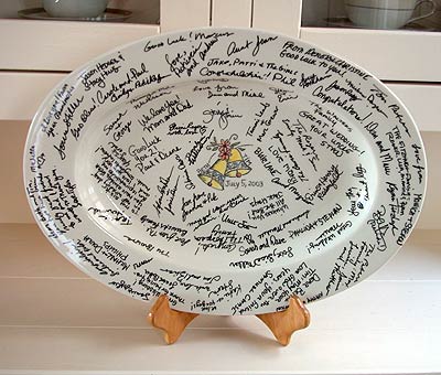 I did the plate and love it. I use it for special occassions and the guests ooh and ahh over it. Im having a bookshelf built in my house and making a special place to display it. :D The only problem is that my husband never wants me to use it!I have a friend who used those guestbook sheets and they were big a flop...no one filled them out!! Not to say that is the case with everyone but her guests didnt bother which was very sad for her.