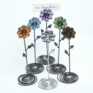 We are buying blank place cards. We are taking images from pictures we've taken, scanning them and lightening them, printing then onto the balnk cards. Then we overlaying a translucent paper over them with the name and table number of each person. We are making corresponding table markers for each table instead of those table markers that come with the place.