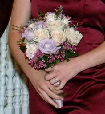 My bridesmaids are wearing that color and thier bouquets are going to be black beauty roses (they are real dard red like the dress), with bluebird roses (a lavendar color) with hypernicum berries mixed in here and there. I originally wanted a big fall mix but with my dress and the girls dresses are very simple and elegant and the florist thought we should keep the bouquets simple and elegant also.