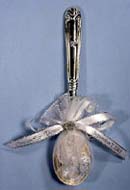 I'm in the midst of wrapping my ice cream scoops - luckily they are boxed.I am wrapping in silver foil paper, tying 5/8' navy satin ribbon & 1/4' white satin ribbon around one side.