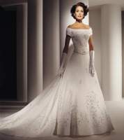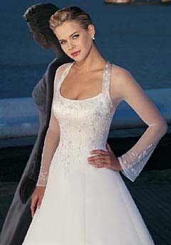 NOvember122003 also had this dress and her seamstress had to add extra to the sleeves to make them less resticting. You can take a look at the proofs on her review on the review board. She got hers in ivory.