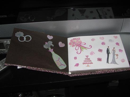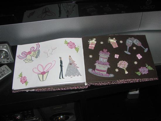 My mom bought an adorable guestbook from eBay for the wedding. We aren't using a guestbook at the wedding since we get a blown-up engagement picture sign in board but I really wanted to use it. I liked the idea of the advice cards but I couldn't find any that matched the pink & brown theme. So I wrapped the book in pink/brown paisley fabric. Added brown cardstock on the inside covers, pink organza ribbon to the cover and stickers on the cover and inside. I also ironed on 'Athina's Bridal Shower' on the cover.The before