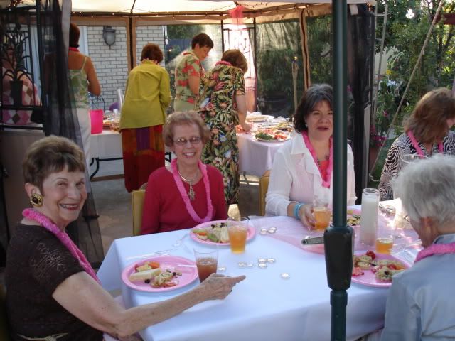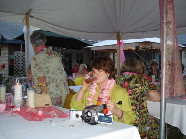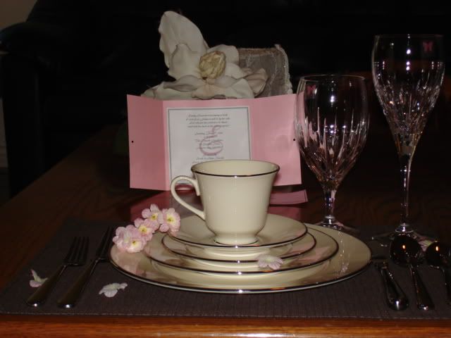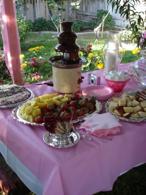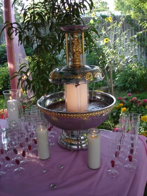 We had a mini desert table with Cheesecake bites, her cake, mini chocolate fountain...and a champagne fountain! The champagne fountain was a hit! We even made a pink champagne to match the theme(with gingerale, brandy, and vodka...as well as a few rasberries...mmmmmm!!!)