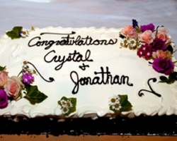What a yummy looking cake!!! I wanted to do a slide show at the wedding so I will save that. I am also thinking hero's and my grandma wants to do all the cooking. It might be in a small hall. A guest list of about 65. I was thinking of having a cake with our picture put on it...too chessy?By the way...Congrats...exactly one year to go! Thanks for your help!
