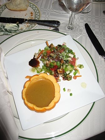 Wanted to post a picture of my appetizer....it was pumpkin soup in a little carved out pumpkin/gourd! With a side salad....it was such a big hit - great presentation. Only thing is I heard 1 person didn't read his menu and thought it was a salad dressing so poured it over his salad