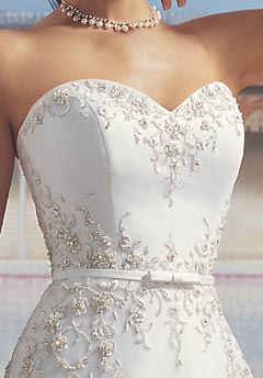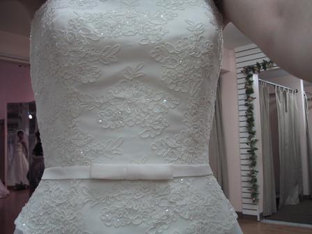 It's a strapless dress with lace at the top of the dress going down into a soft 'V' at the waist. It also has the same lace in a 4 inch trim at the bottom of the dress and a narrow bow at the waist. It had a train (possibly semi-cathedral length).