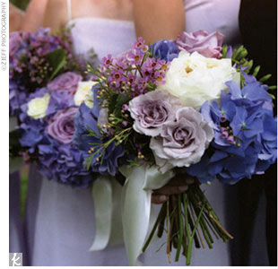 we're doing leaf green dresses w/ yellow roses as the main flower. CPs are bigger versions based on the pic below w/o the purple--just yellow roses. the closest thing we have to a theme is just that i want everything to be really natural and summery--lush w/ flowers and a little beachy.