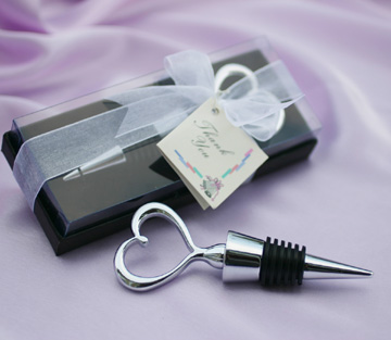 My favor was the heart wine stopper. I took the wine stopper out of the black velvet bag and laid the wine stopper on top of it. Then I tied the strings sround the narrowest part of the topper. I then put each in an organza bag.I had favor tags made by SonicStef.