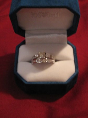 This is my e-ring and FH and I are still not sure if we are going to buy bands or his mom is offering us his grandparents wedding bands. If we go the grandparent route I would have to wear my ering on my right hand and wear the band on my left. Either way I'm happy.