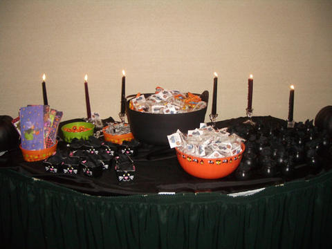 I'm doing a Halloween wedding next year. I have lots of ideas I want to incorporate into the day to make it more Halloween-ish. I'm going to get living statues during the cocktail hour to scare the guests. The placecards will be attached to mini-pumpkins. When each guest comes to their table they will each have a mask at their place setting. I want caramel apples on the tables as favors and I'm going to have a candy bar at the end of the night (kind of like trick or treating!). I'm doing my centerpieces in funkins (fake carvable pumpkins - no smell!). I also think I want to have mini hurricane holders with pumpkin candles held in place with candy corns. Hope this helps! Good luck!