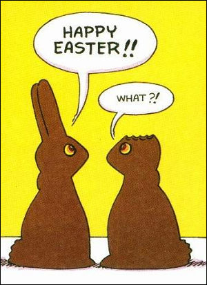 i love that picture happy easterthere's another ive seen where the first bunny's tail is missing and he's saying 'my butt hurts!' and the other one says 'what!?' lol